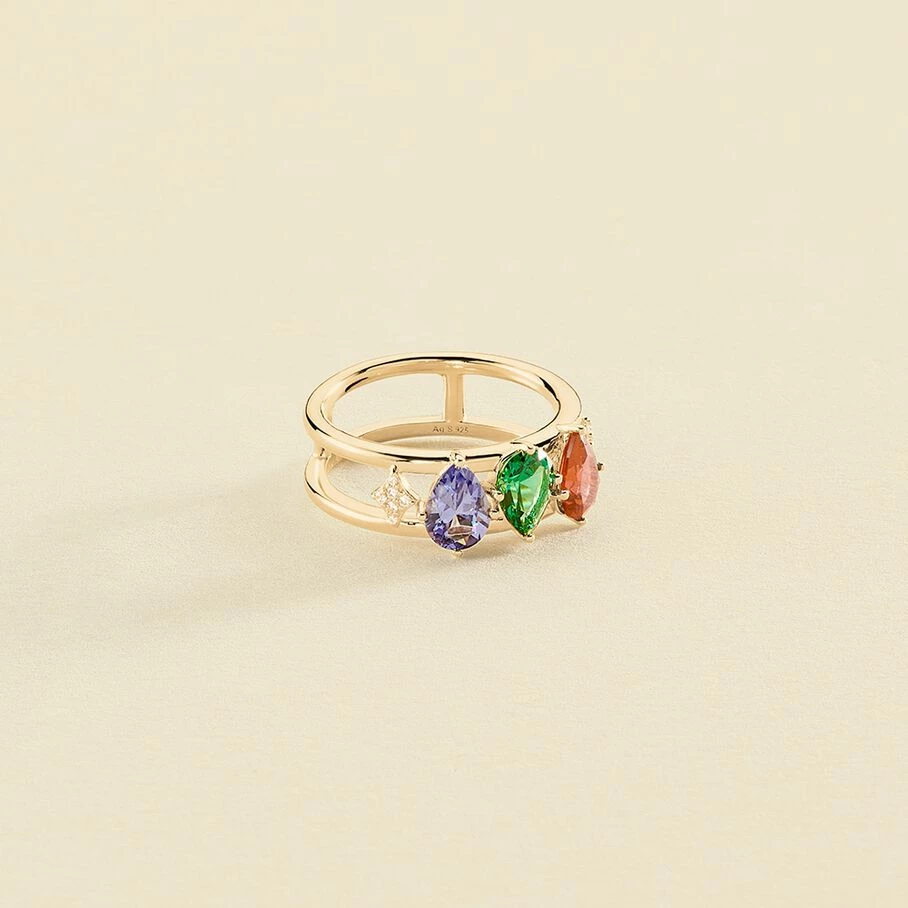 Bague tonneau évidée, en argent véritable doré 750/1000, dont la partie centrale est ornée d’oxydes de zirconium multicolores