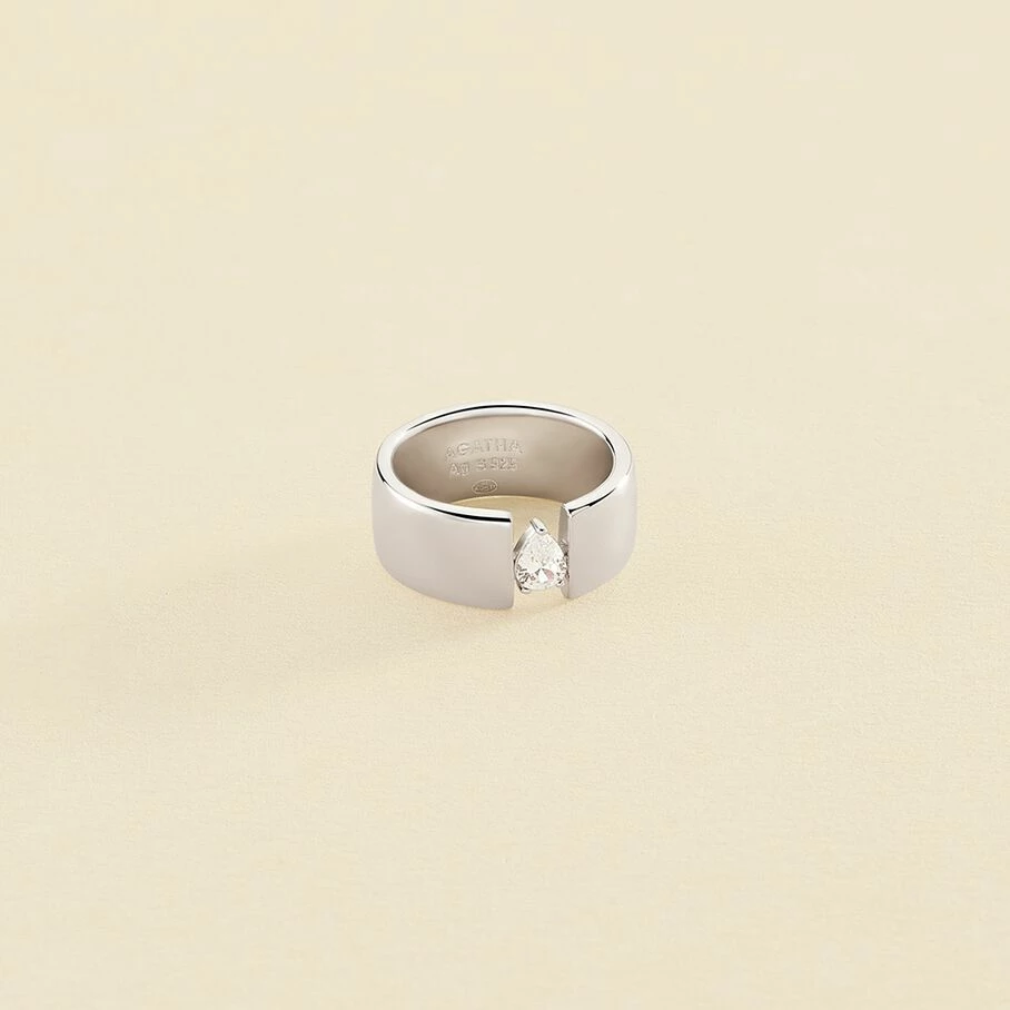 Bague large, en argent véritable, avec un oxyde de zirconium de forme poire enserré dans le corps de bague