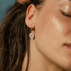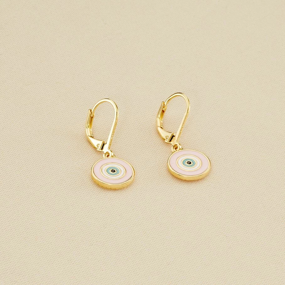 Boucles d’oreilles dormeuses, en laiton doré à l’or fin, avec un œil turc émaillé centré d’un oxyde de zirconium