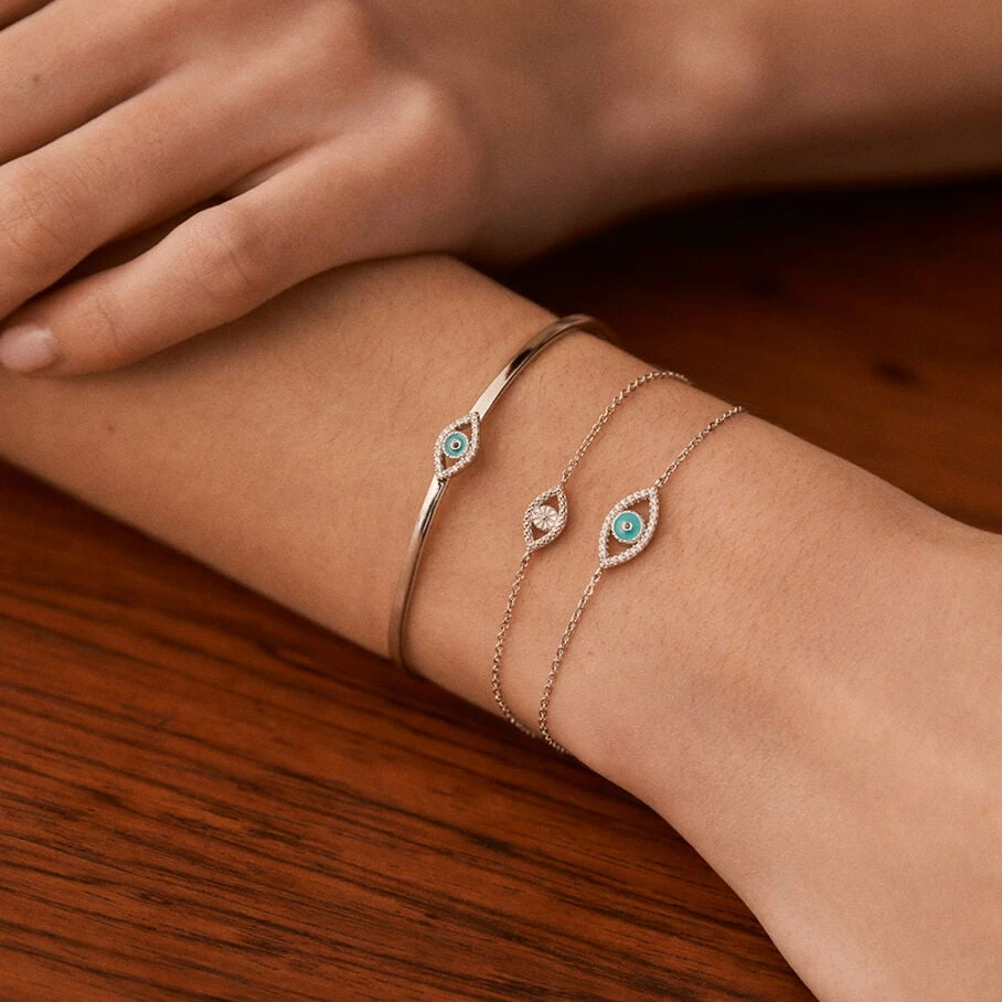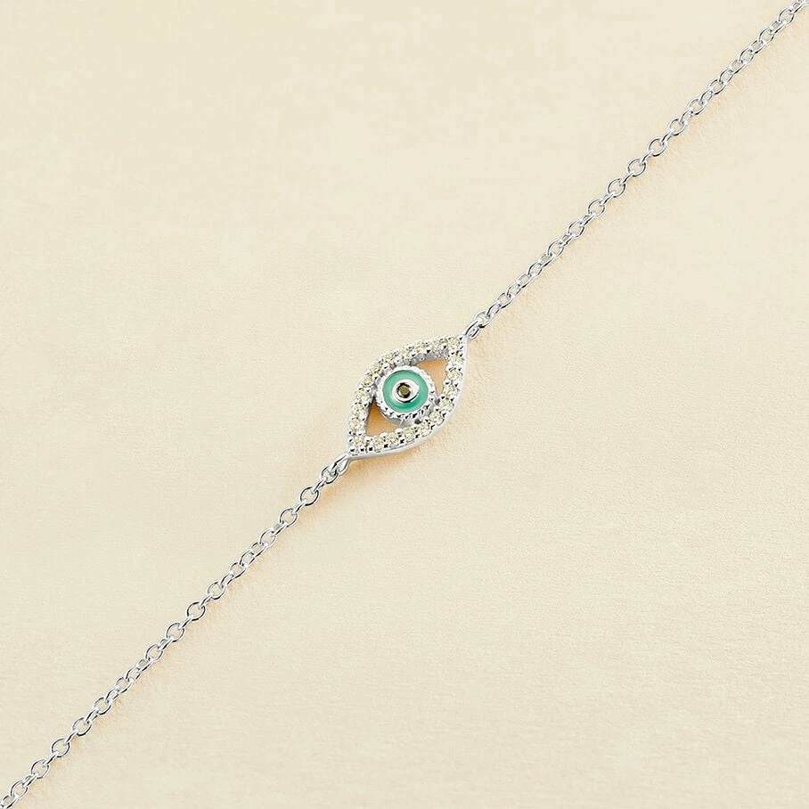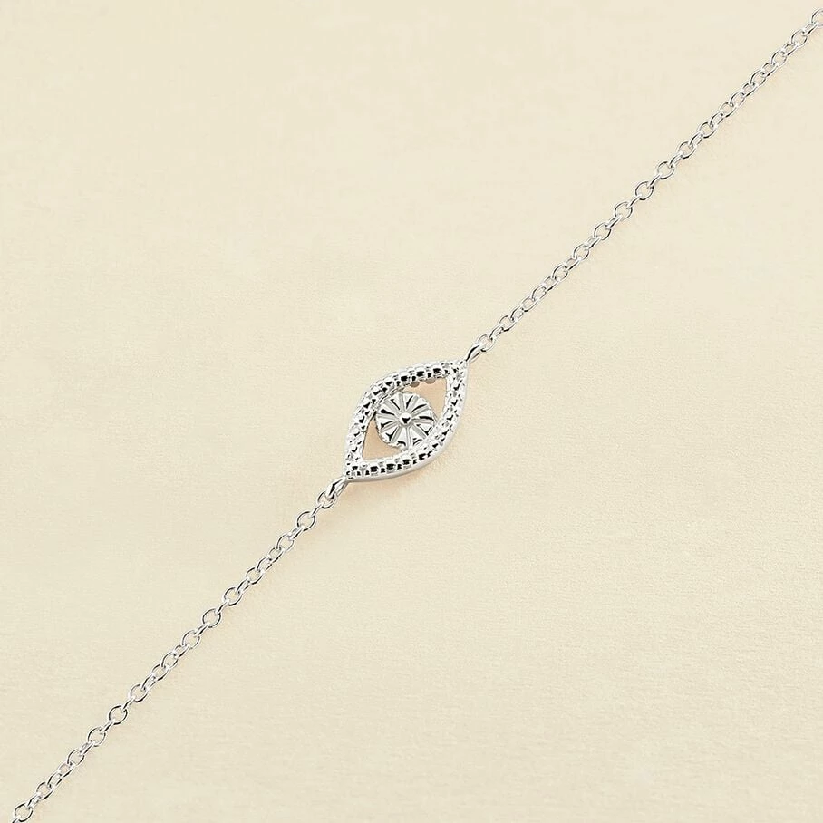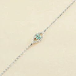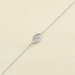 Bracelet, en argent véritable 925/1000, dont la chaine est ornée d’un petit œil turc. L’iris émaillé et le contour de l’œil serti d’oxydes de zirconium apportent un vrai raffinement et éclat au produit!