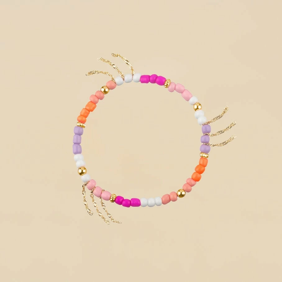 Bracelet elastique, en laiton doré 750/1000, perles de verre enfilées et pompons de chaines