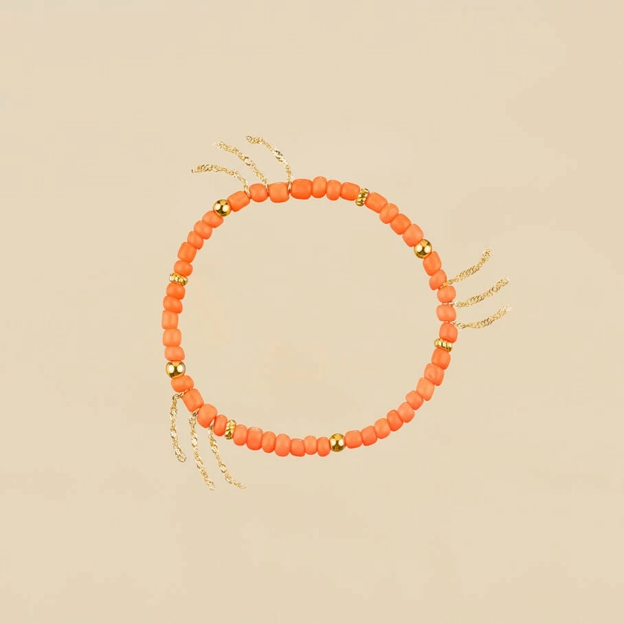 Bracelet elastique, en laiton doré 750/1000, perles de verre enfilées et pompons de chaines