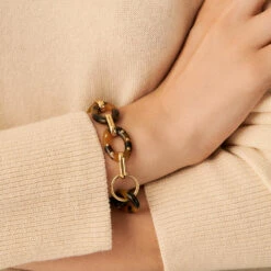 Collier mi-long en laiton doré 750/1000, maillons ovales en acetate et boule métal en pampille, fermoir T-bar.Ces chaines amovibles offrent un multiporté : en coller mi long, en collier Y ou en collier court assorti d’un bracelet.