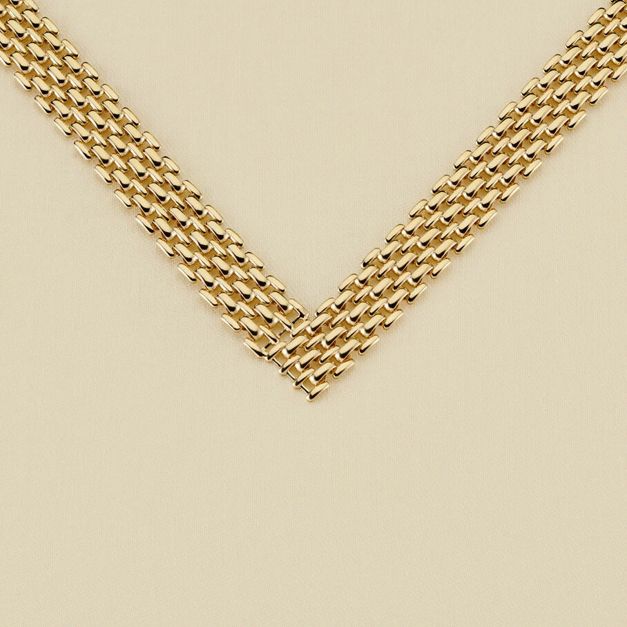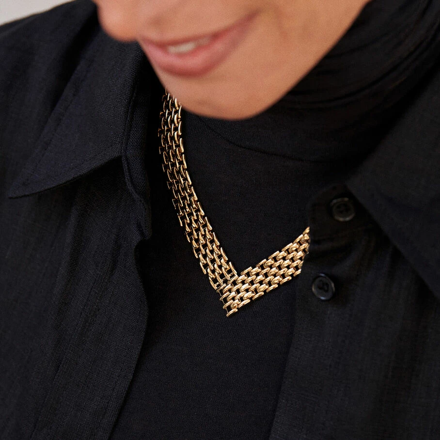 Collier de forme V, en laiton et étain, dont la maille ressemble à une maille de montre