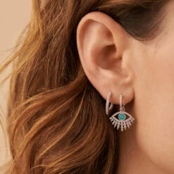 Créoles de 14mm de diamètre, en argent véritable 925/1000, sur lesquelles un œil turc a été ajouté en breloque. L’iris émaillé et le contour de l’œil serti d’oxydes de zirconium apportent un vrai raffinement et éclat au produit! Au besoin la breloque peut se retirer pour un look déparaillé ou encore un look plus simple avec de petites créoles serties d’oxydes de zirconium seulement. Des boucles d’oreilles 3 en 1 à porter au gré de vos tenues et humeur!