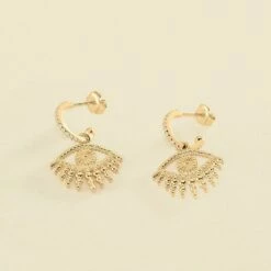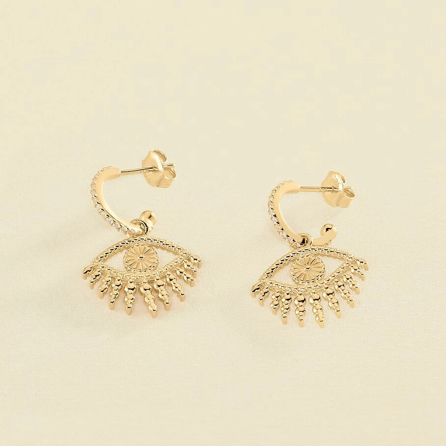 Créoles de 14mm de diamètre, en argent véritable 925/1000 et dorées 750/1000, sur lesquelles un œil turc a été ajouté en breloque. L’iris émaillé et le contour de l’œil serti d’oxydes de zirconium apportent un vrai raffinement et éclat au produit! Au besoin la breloque peut se retirer pour un look déparaillé ou encore un look plus simple avec de petites créoles serties d’oxydes de zirconium seulement. Des boucles d’oreilles 3 en 1 à porter au gré de vos tenues et humeur!