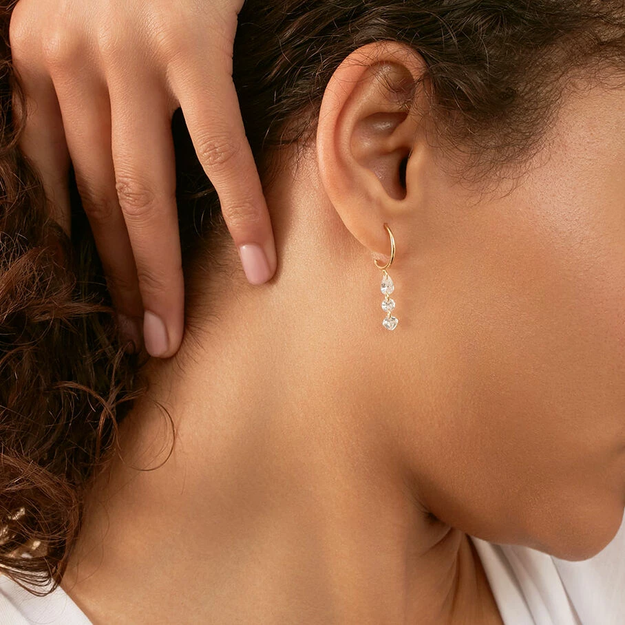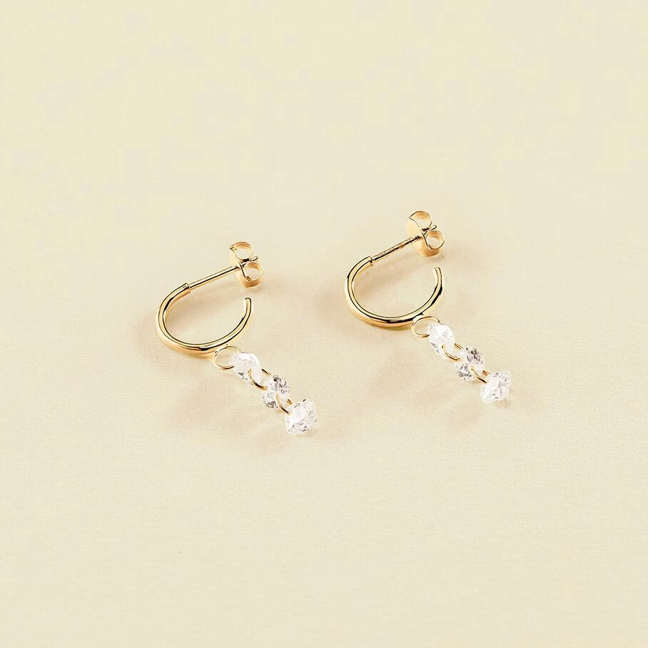 Créoles de 12 mm de diamètre, en argent véritable doré 750/1000, avec en pampille une trilogie d’oxydes de zirconium percés en formes de poire, rond et coussin