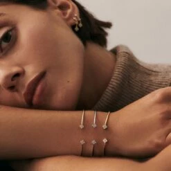 Jonc fin ouvert, en argent véritable doré 750/1000, avec des fleurs d’oxydes de zirconium aux extrémités et un fin graineti sur le pourtour