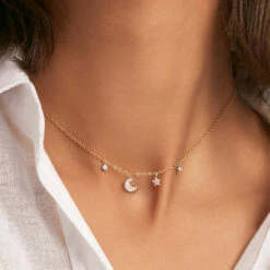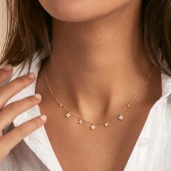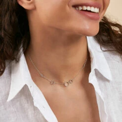Collier Y, en argent véritable, fait de maille dont le fermoir représente deux gouttes entrelacées et serties d’oxydes de zirconium sur la tranche extérieure
